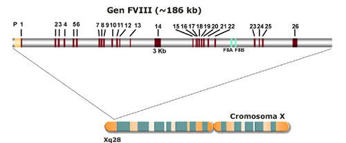 El gen FVIII se encuentra en la porción telomérica distal del brazo largo del cromosoma X, en la banda Xq28 (Poustka y col., 1991). Fue caracterizado en 1984 (Gitschier y col., 1984), y resultó ser el gen más grande y complejo conocido hasta entonces (Figura 1). Consta de 26 exones que se extienden a lo largo de unas 186.000 bp en el genoma humano y que dan lugar a un mRNA de prácticamente 9 Kb, incluyendo 7.053 nucleótidos codificantes (Toole y col., 1984; Wood y col., 1984). Veinticuatro de los exones tienen un tamaño que varía entre las 69 y las 262 bp, mientras que los dos restantes, los exones 14 y 26, contienen 3106 y 1958 bp respectivamente. La mayor parte del exón 26 corresponde a secuencia transcrita y no traducida. De los 25 intrones 6 tienen más de 14 Kb, uno de los cuales, el intrón 22, contiene dos genes denominados F8A y F8B que no parecen tener ninguna vinculación fisiológica con el gen huésped. F8B se transcribe en la misma dirección que el gen FVIII y da lugar a un mRNA de 2.5 Kb que incluye un exón propio y los exones 23 a 26 del gen FVIII (Levinson y col., 1992). Por su parte, el gen F8A no contiene intrones y se transcribe en sentido opuesto (Levinson y col., 1990). A unas 400 Kb en posición telomérica distal del gen FVIII se encuentran dos copias del gen F8A, con una homología cercana al 100% y cuya presencia, como se explica más adelante, es la responsable de casi el 50% de las hemofilias A graves (Lakich y col., 1993). Si bien los tránscritos del gen F8A han sido detectados en una amplia variedad de tejidos, su función es todavía desconocida. El gen F8B parece estar relacionado con mecanismos de desarrollo embrionario según se desprende de estudios realizados en ratones quiméricos y transgénicos (Valleix y col., 1999).