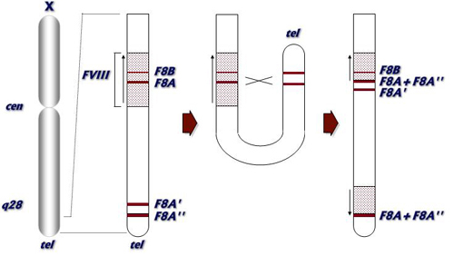 recombinación involucra al gen F8A’, la copia más cercana al gen FVIII la